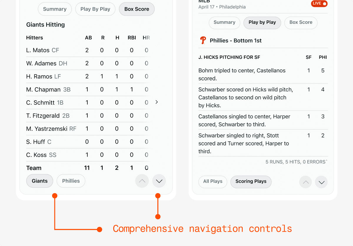 Meticulously analyzing current scoreboards and using our information architecture was essential in content planning and helping determine where and what tabs were needed, and what navigation controls needed real estate.