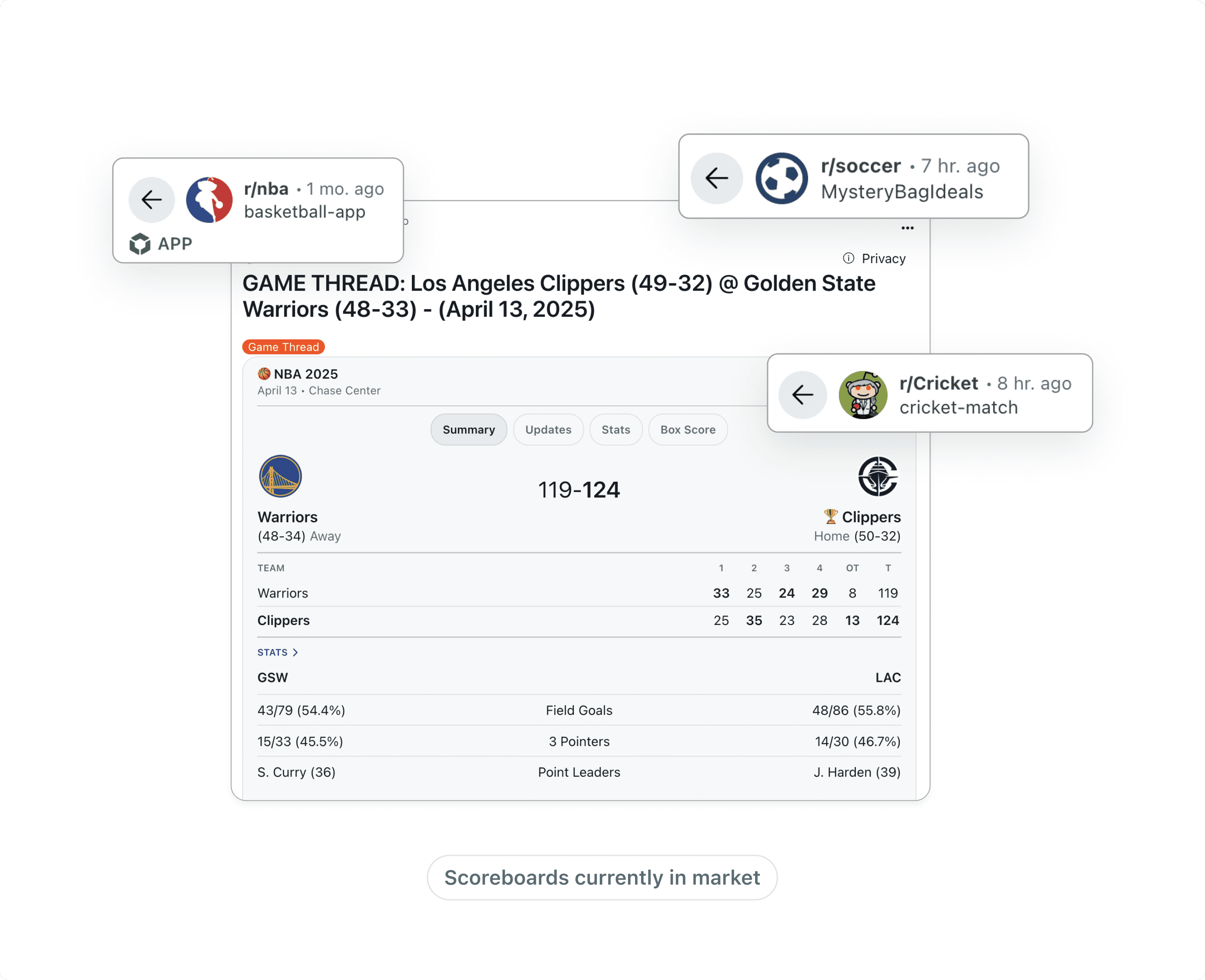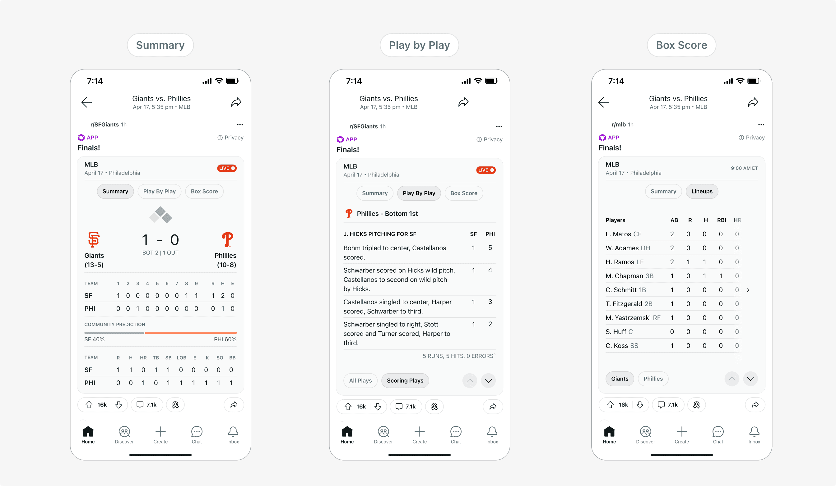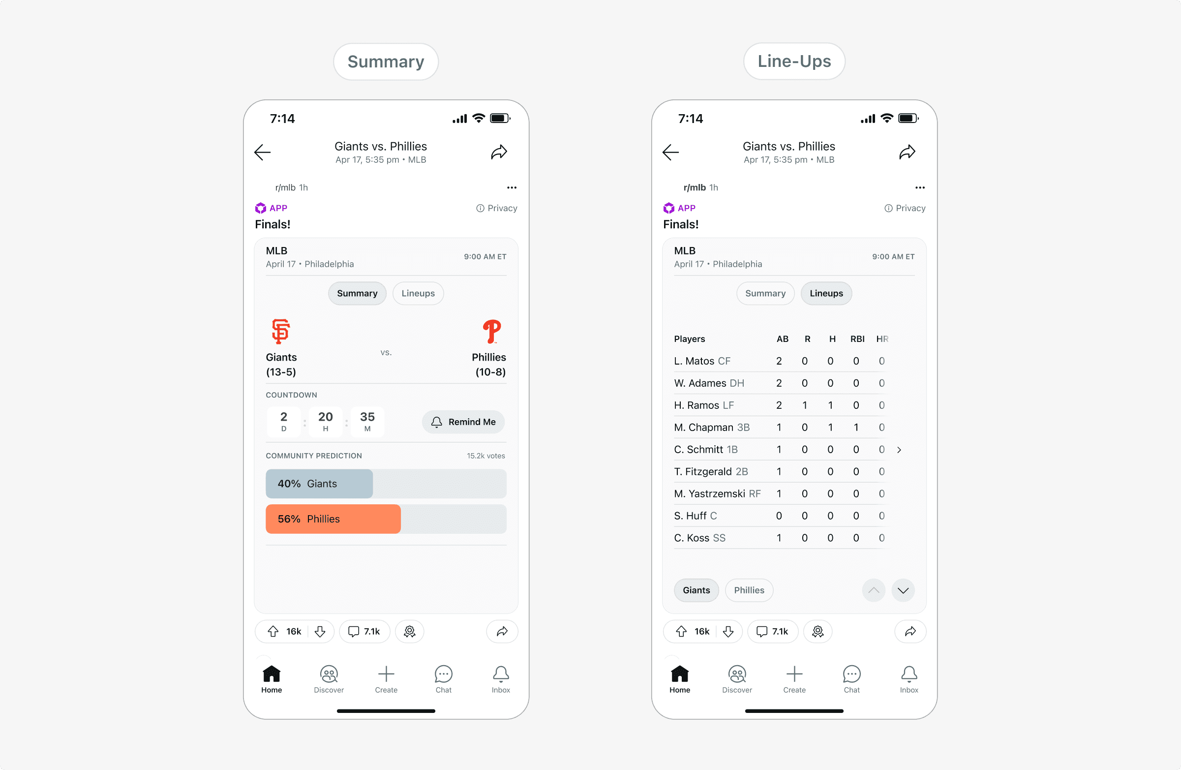 We had to get creative with how we presented complex, dynamic data like live scores and game stats within a limited UI toolkit, all while making it feel native to Reddit’s ecosystem.