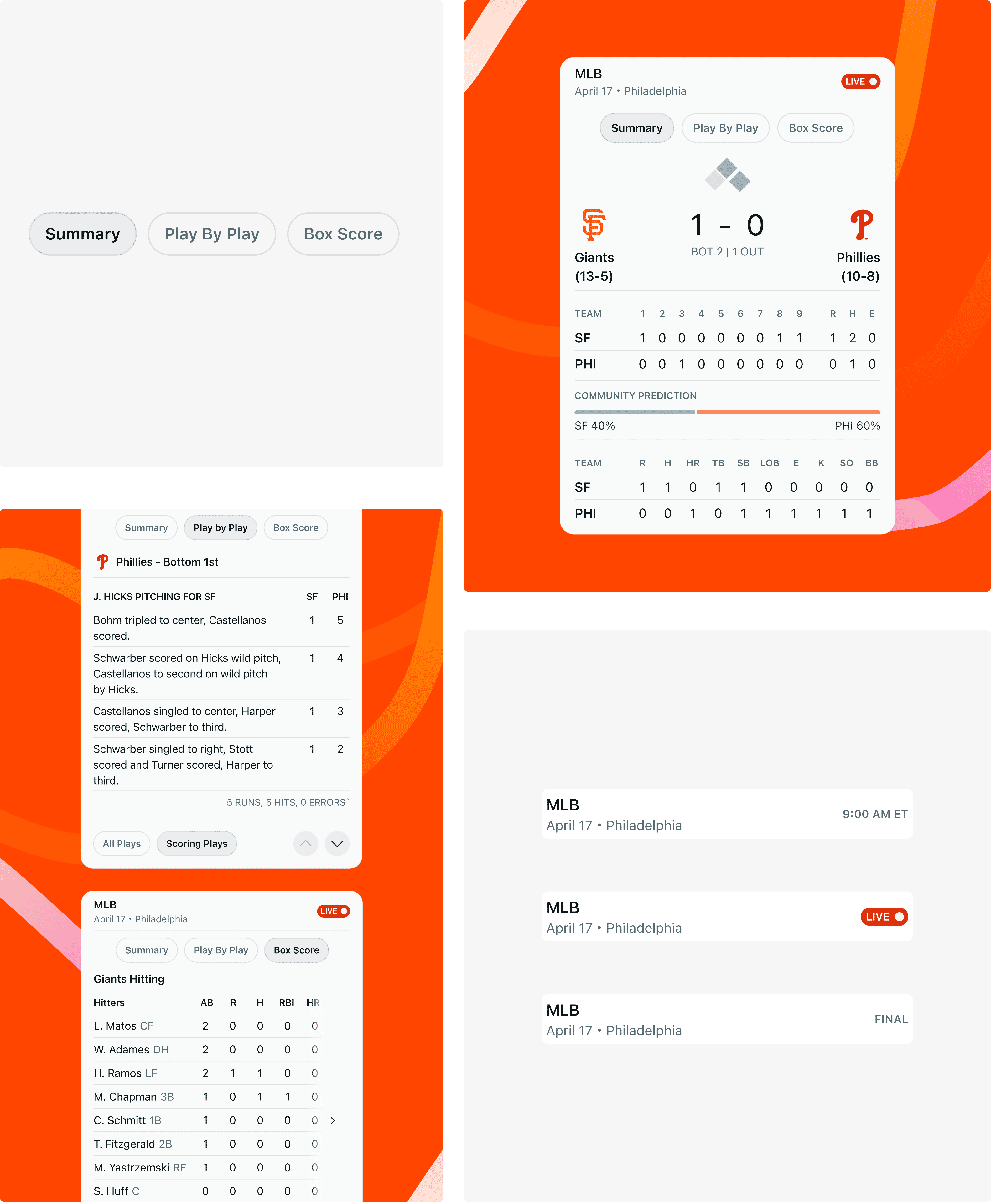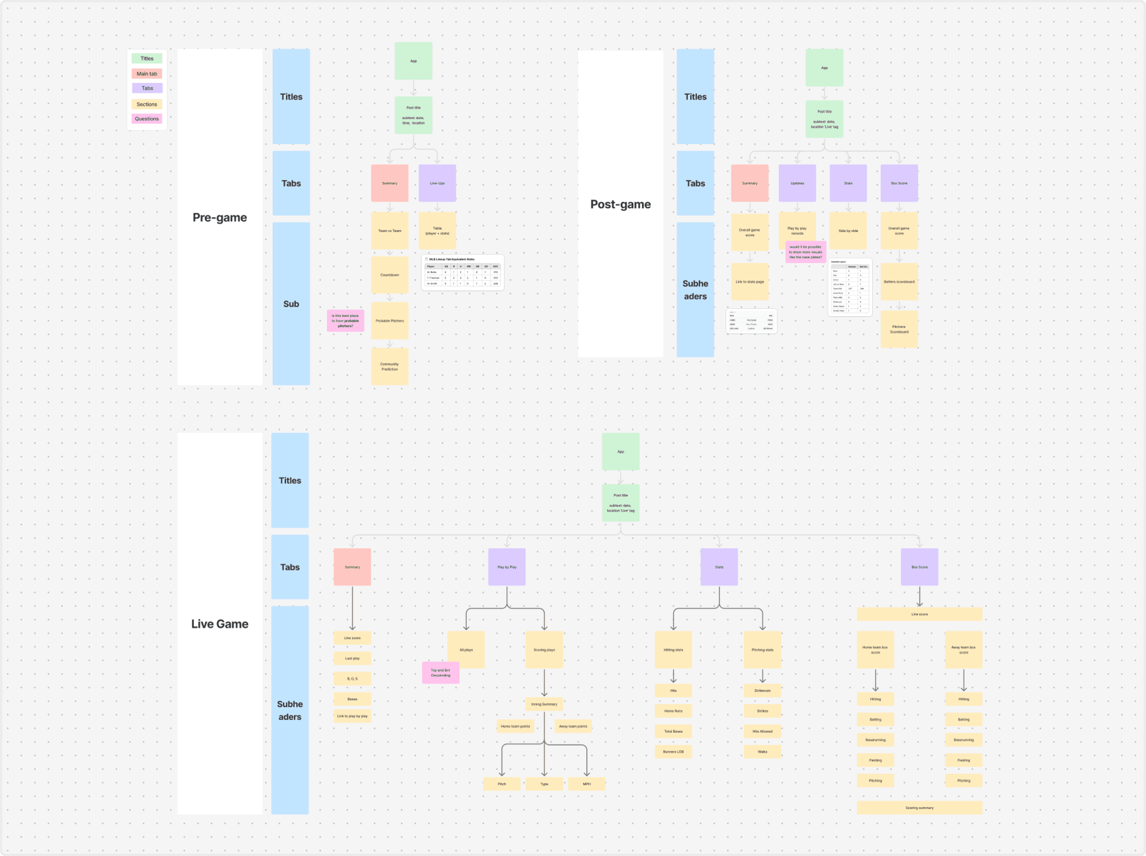 Within each of these three phases, I sorted information based on our 4 main tabs: summary, play-by-play, stats, and box score. I worked backwards to organize overlapping information vs. distinct information across the three phases, following existing mental models based on existing baseball scoreboards.