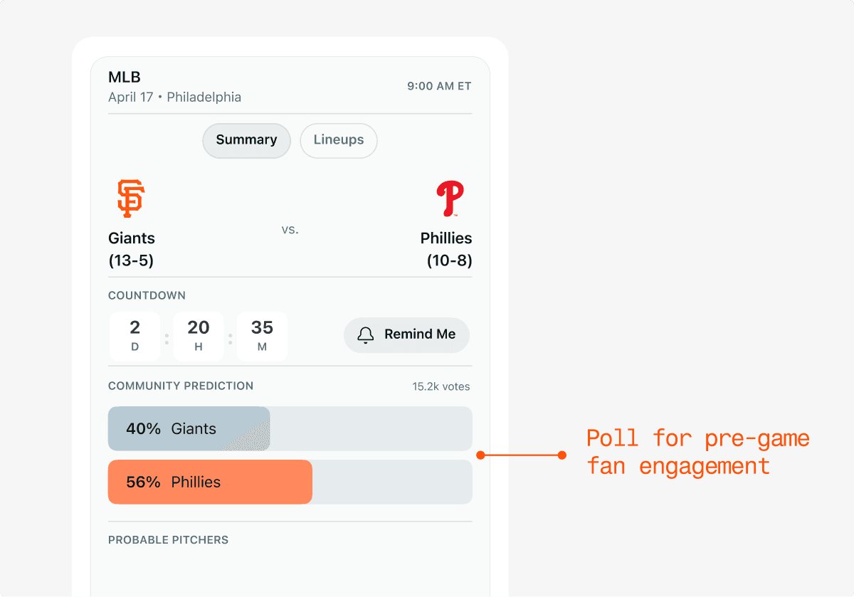 Users can participate in community prediction polls to build pre-game anticipation and drive active engagement before live play begins.