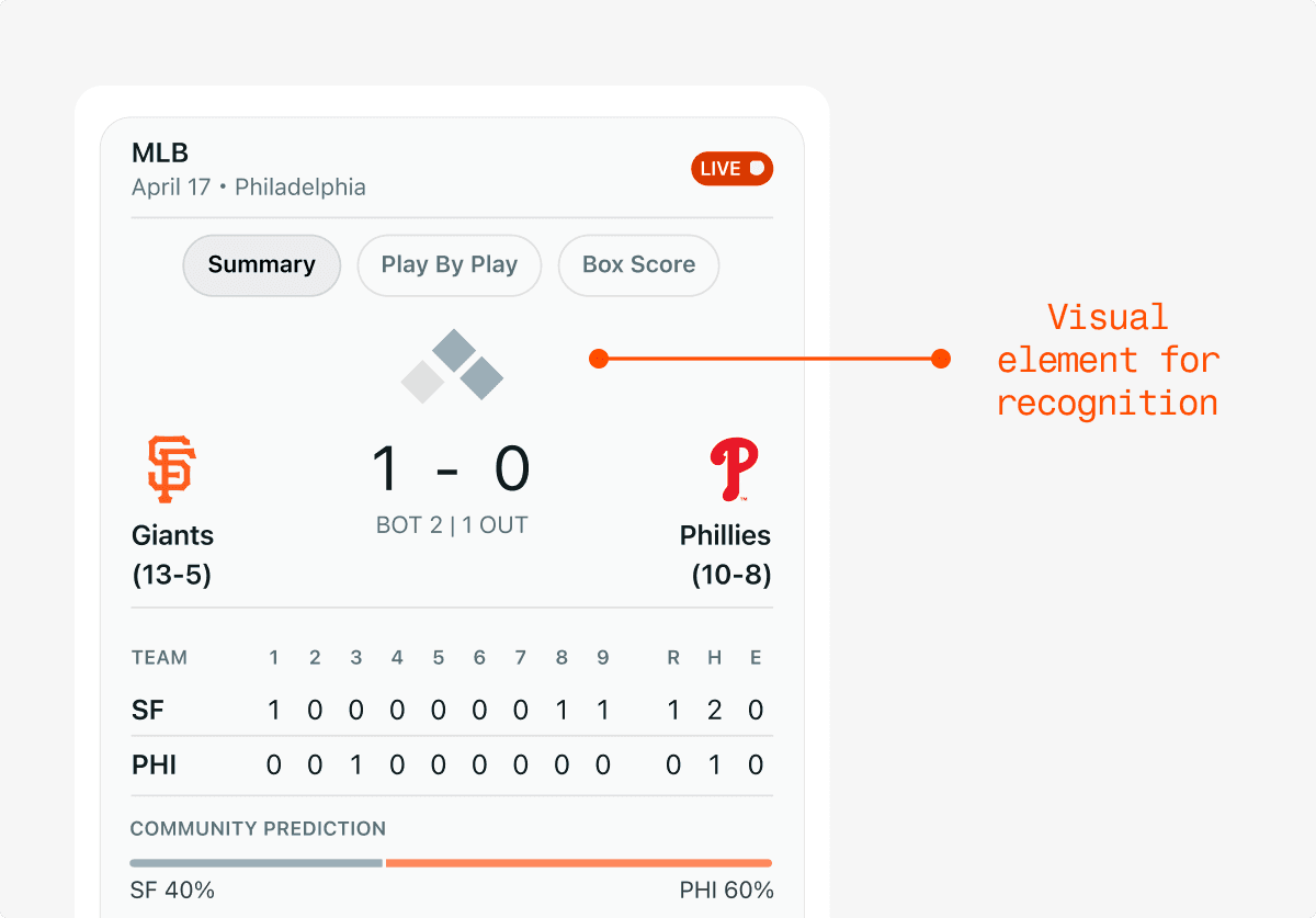 The baseball diamond provides immediate visual recognition of game status, reducing cognitive load while tracking live progress.
